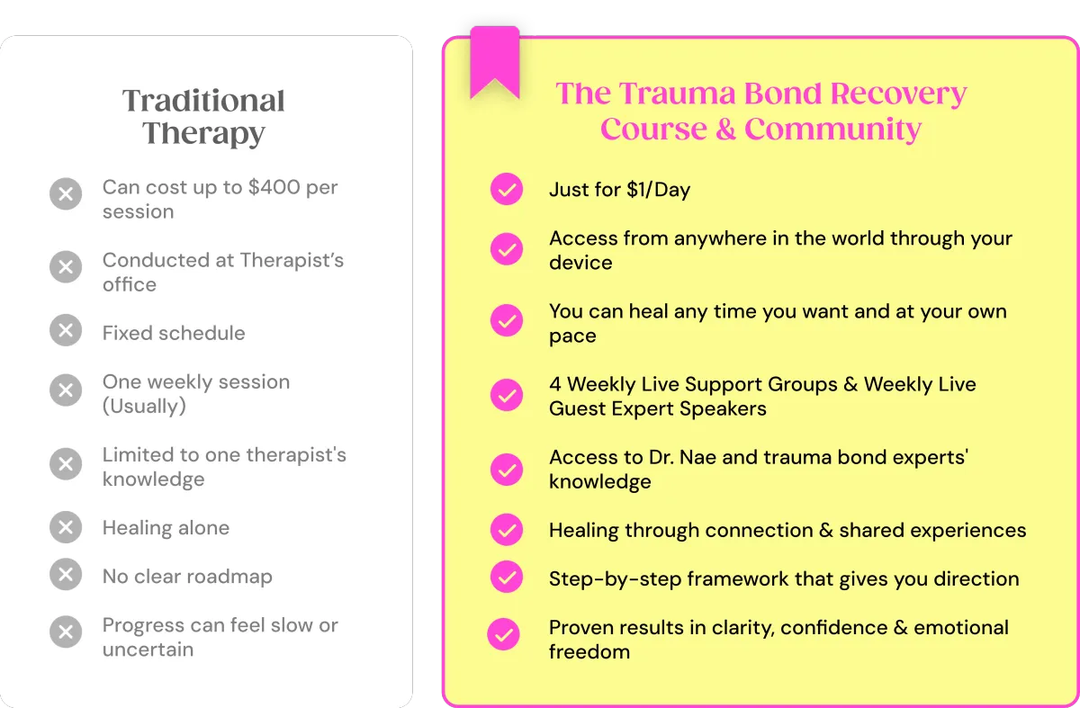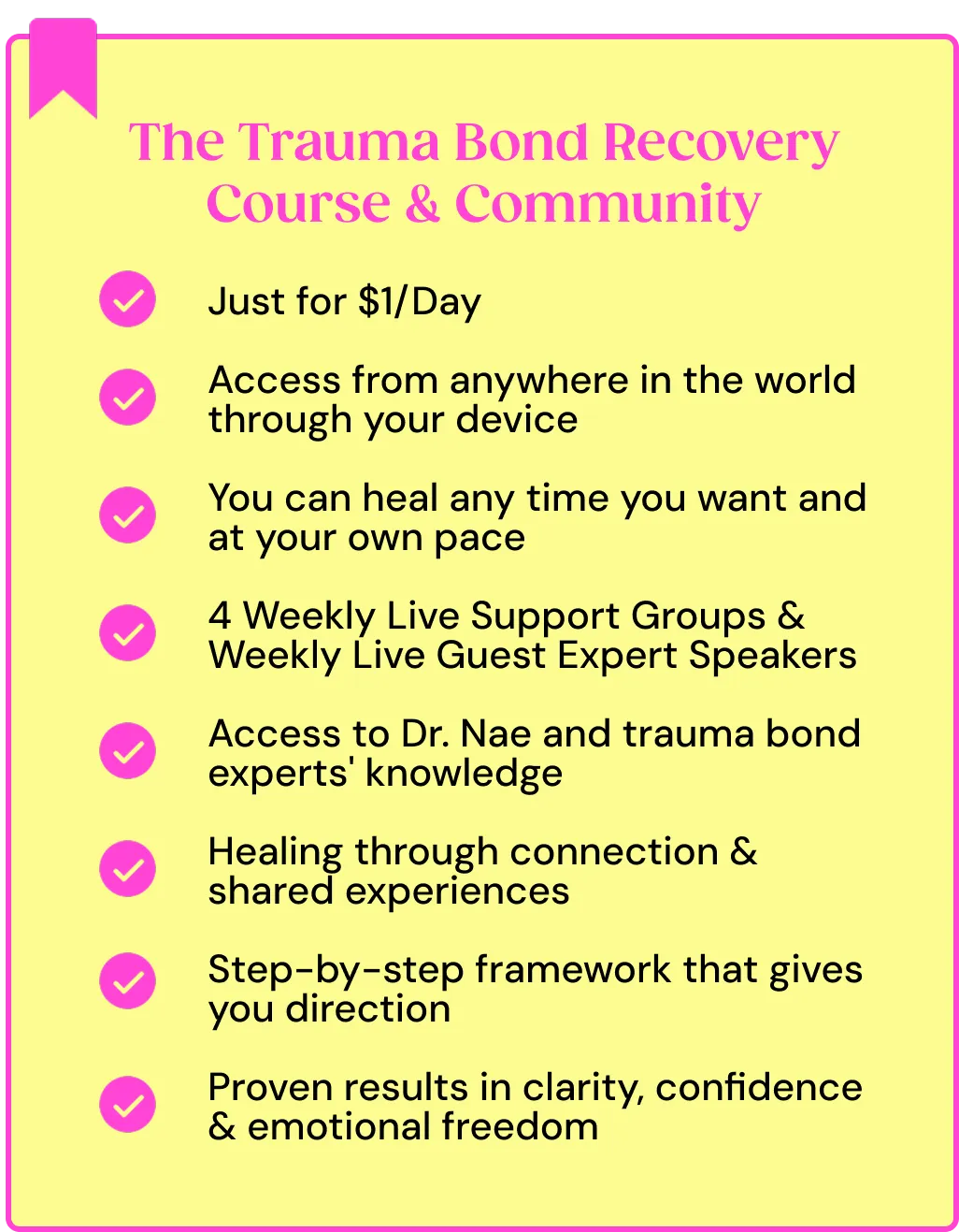 You’ll get weekly live sessions with Dr. Nae, group coaching, access to a secure online community, healing challenges, expert trauma workshops, worksheets, assessments, meditations, and lifetime tools. Also every week Dr. Nae interviews a trauma therapist to deepen your education.